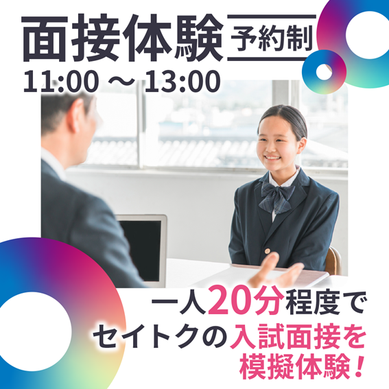 一人20分程度でセイトクの入試面接を模擬体験!本番ではありませんので、お気軽に体験してみてくださいね!下記オープンキャンパスエクスプレス受付から時間指定で予約できます。