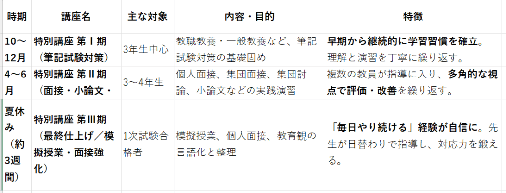 筆記・面接・模擬授業など、試験に必要な力を体系的に育てる仕組みです。