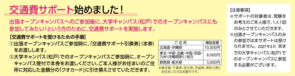出張オープンキャンパス参加後に、千葉・松戸キャンパスで開催されるオープンキャンパスにご参加いただくと、交通費の一部をサポートします!
