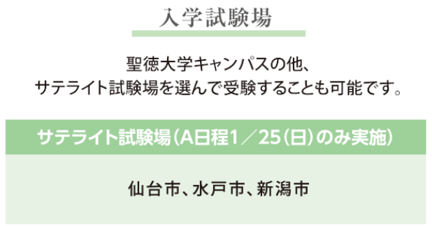 一般選抜の入試A日程は、1/25(日)、1/26(月)に行われ、いずれか1日を選んで受けることができます(両日受けることも可能です)。試験会場は、千葉県松戸市の聖徳大学試験会場の他、サテライト試験場も以下3カ所に用意しています。