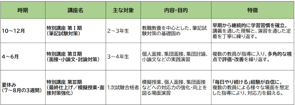 筆記・面接・模擬授業など、試験に必要な力を体系的に育てる仕組みです。